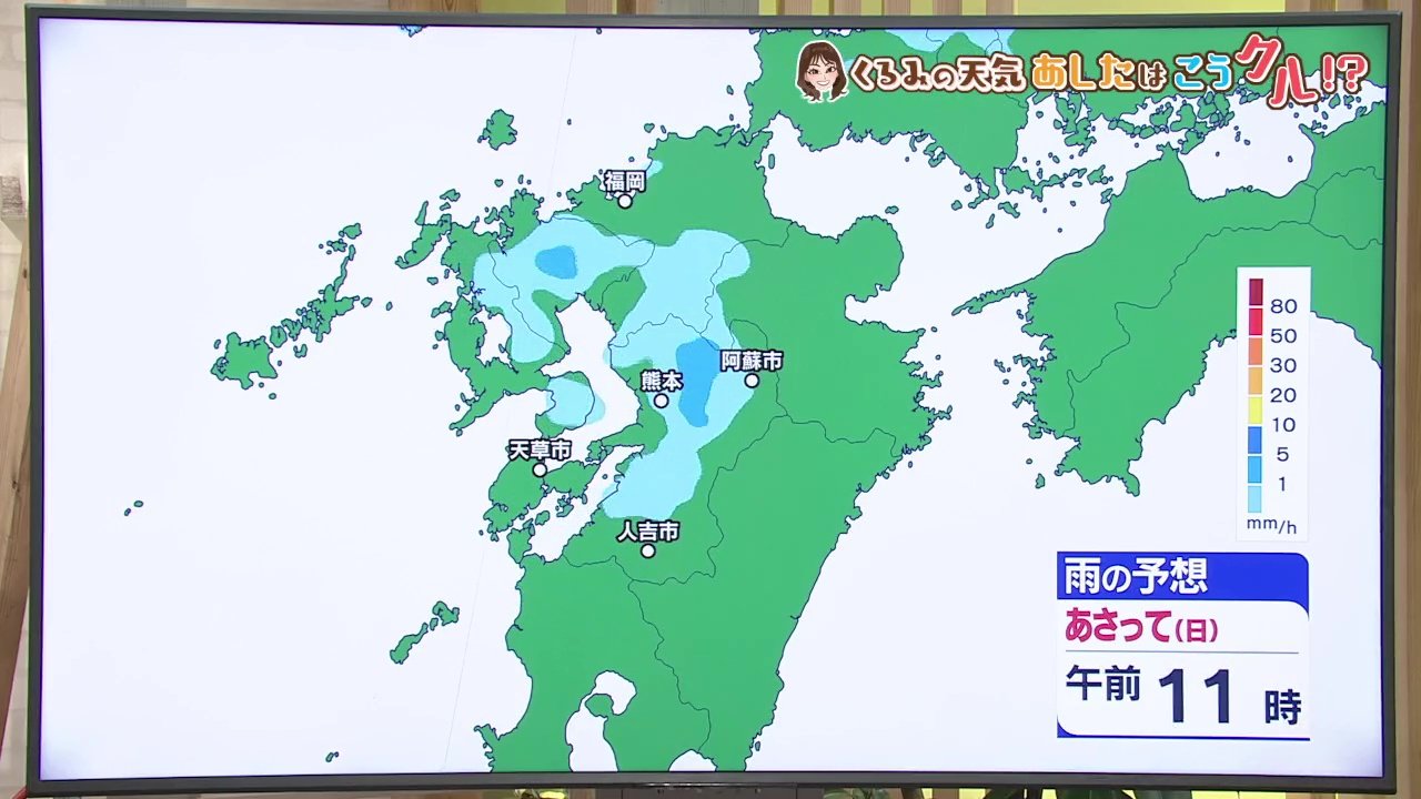 雨の予想です。1日(土)の夜から雨が降りだすところがあるでしょう。1日の夜は九州の北側を雨雲が通過していき、熊本県内にも一部雨雲がかかる可能性があります。