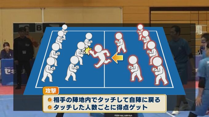 攻撃側は、1人で敵陣に入り相手選手にタッチして自陣へ戻ると得点。タッチした人数の分だけ点が入ります。ただし、制限時間は30秒。そして、攻撃中は「カバディ」と言い続ける必要があります。