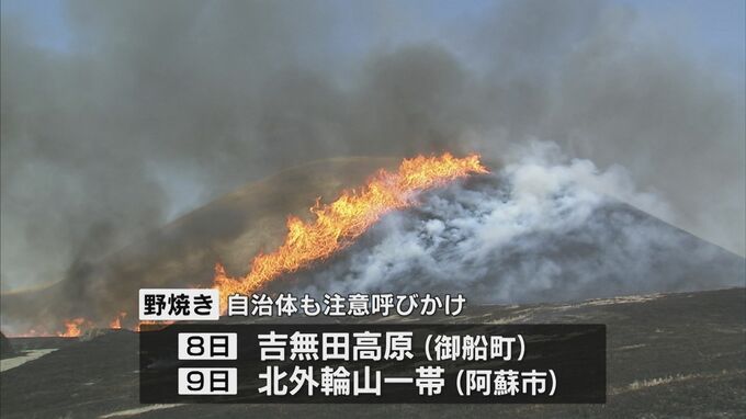 熊本県内では3月8日に御船町の吉無田高原で、3月9日には阿蘇市の北外輪山一帯で野焼きを予定していて、自治体も注意を呼びかけています。