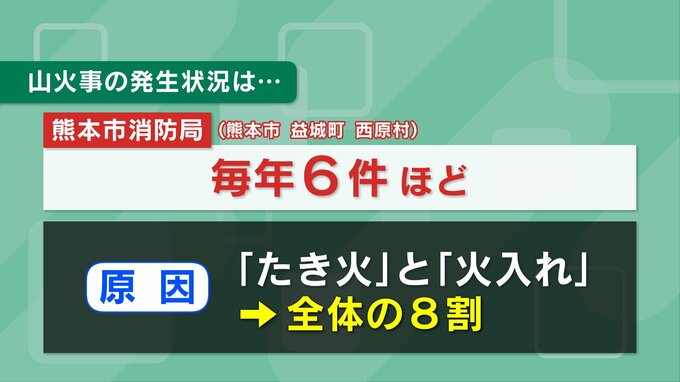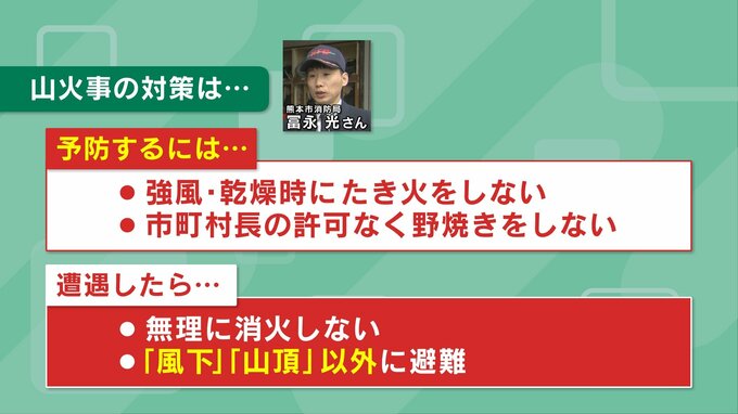 熊本市消防局は「強風や乾燥している時にたき火をしないこと」「市町村長の許可なく野焼きをしないこと」などを求めていて、万が一山火事に遭遇した時には、風下や山頂を避けて避難することを呼びかけています。