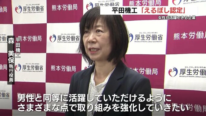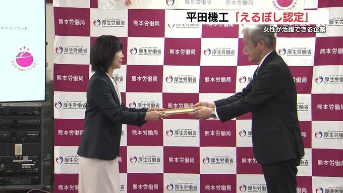 「えるぼし認定」は基準を満たした項目数などによって3段階の「えるぼし」と「プラチナえるぼし」に分かれていて、今回選ばれた「平田機工」は5つの基準のうちすべてを満たした3段階目のえるぼしに選ばれました。