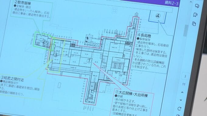 具体的には、(2)の数寄屋棟(すきやとう)は建物を解体して復旧。また(4)の長局櫓(ながつぼねやぐら)は建物を解体し部材を保存。一方(1)の大広間棟(おおひろまとう)・大台所棟(おおだいどころとう)と(3)の昭君之間付近(しょうくんのまふきん)は解体せずに修繕工事を行います。※【画像】参照
