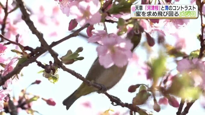 今年は例年に比べ1か月ほど咲くのが遅いということですが、蒼い海に映えるサクラの木々の間をメジロが蜜を求めて飛び回る姿が見られました。