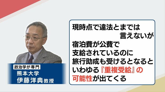 今回の問題点について、熊本大学で政治学が専門の伊藤洋典(いとう ひろのり)教授は「現時点で違法とまでは言えないが、宿泊費が公費で支給されているのに旅行助成も受けるとなると、いわゆる『重複受給』の可能性が出てくる」と指摘しています。