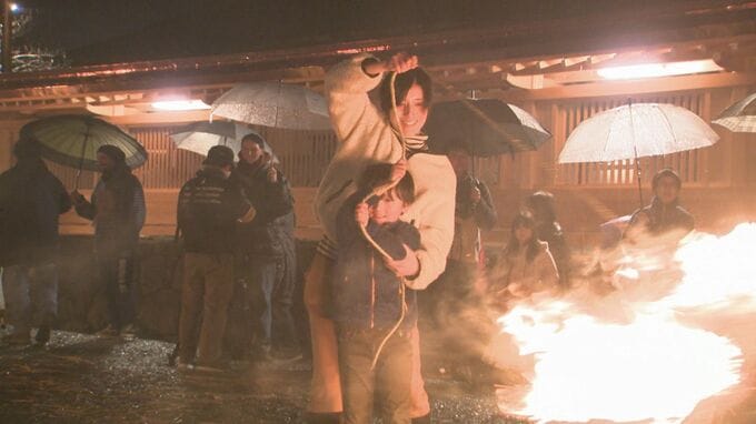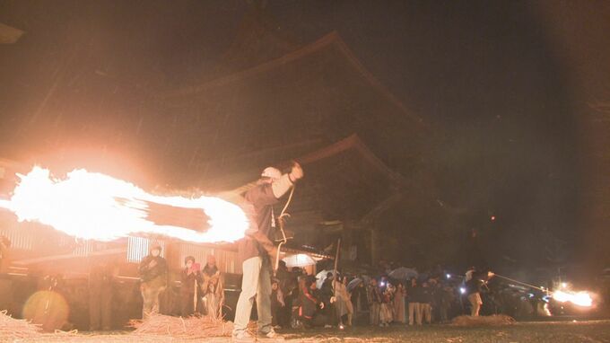 熊本地震からの復旧工事が2024年12月に完了してから初めての火振り神事となり、復旧した楼門の下では再建を祝うように炎の輪が広がりました。