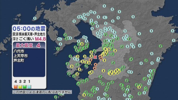 気象庁によりますと、きょう(18日)午前5時ごろ、天草・芦北地方を震源とするマグニチュード4.8の地震があり、熊本県八代市と上天草市、芦北町で震度4、人吉市や水俣市などで震度3の揺れを観測しました。