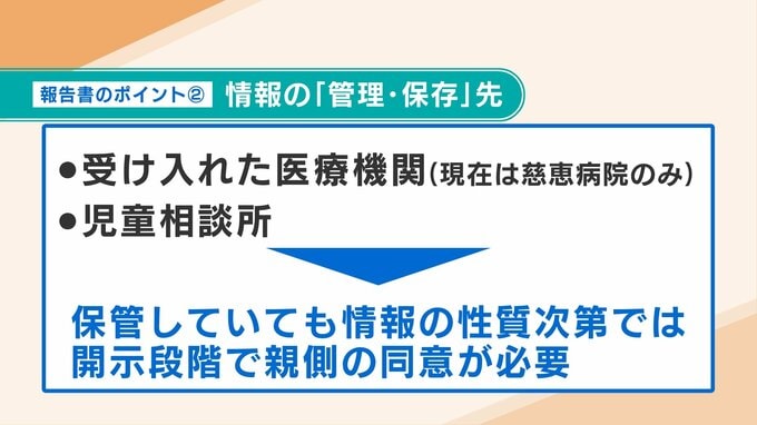 次に情報の「管理・保存先」については、今は慈恵病院だけになりますが、受け入れた医療機関、そして児童相談所を指定しました。ただし、情報の性質によっては開示の段階で親側の同意が必要と定めました。
