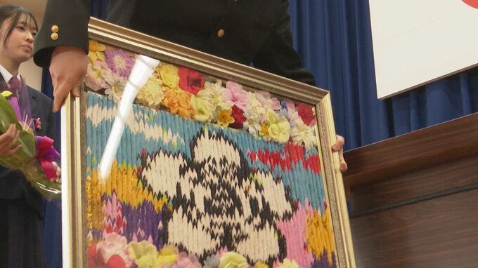 きょう(28日)は生徒会が中心となって送る会が開かれ、生徒たちが気持ちを込めて作った折り鶴を天草高校の校章にして岡部さんに手渡しました。