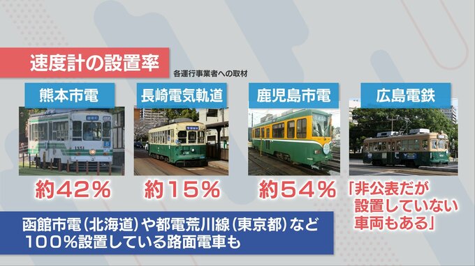 速度計を設置しているのは、熊本市電は約42%ですが、長崎電気軌道は約15%、鹿児島市電は約54%。広島電鉄はデータは非公表ですが「速度計を設置していない車両もある」ということでした。