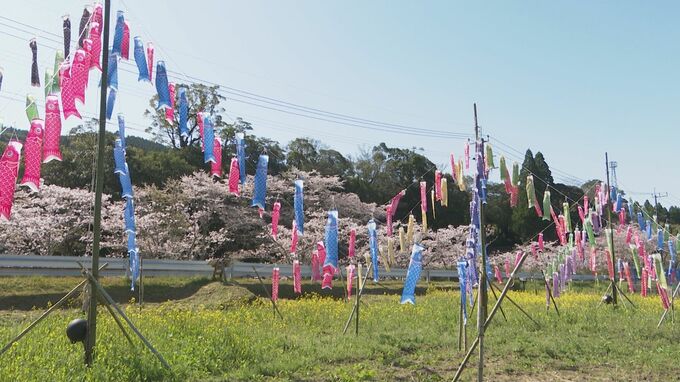 熊本県上天草市では、いま、サクラと菜の花の中を泳ぐ、こいのぼりが見られます。