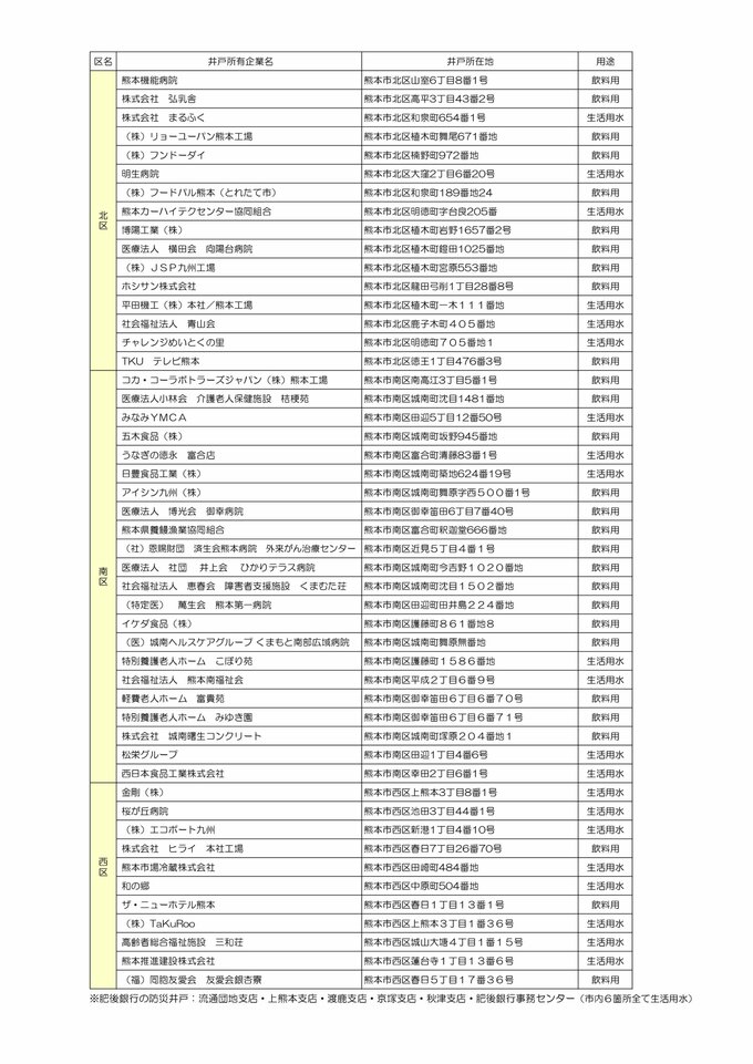 銀行にも!?設置進む『災害用井戸』 “熊本市内に101か所” あなたの近くの井戸はどこ?【設置場所一覧掲載】 2025年4月9日(水) 19:24 国内 熊本市内の設置場所は? 熊本市内には101か所の災害用井戸があります。自宅そばの井戸の場所をぜひご確認ください。(中央区31か所、南区23か所、東区19か所、北区16か所、西区12か所)※2025年4月1日現在 熊本市ホームページより ※一部改変 熊本市ホームページより ※一部改変