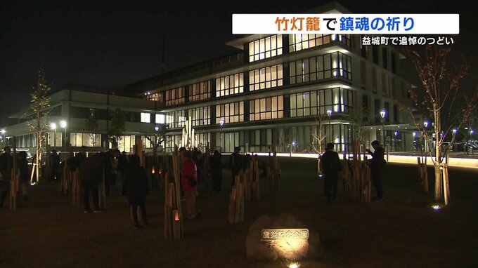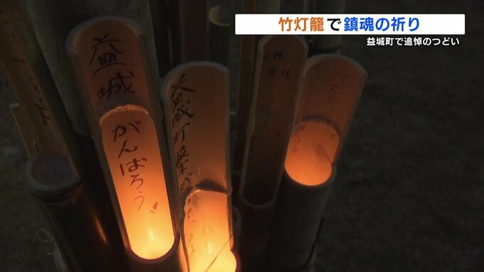 参加者はそれぞれの竹灯籠に火を灯しながら、熊本地震で亡くなった人たちの鎮魂と復興への願いを捧げていました。