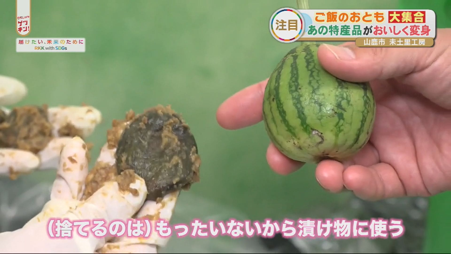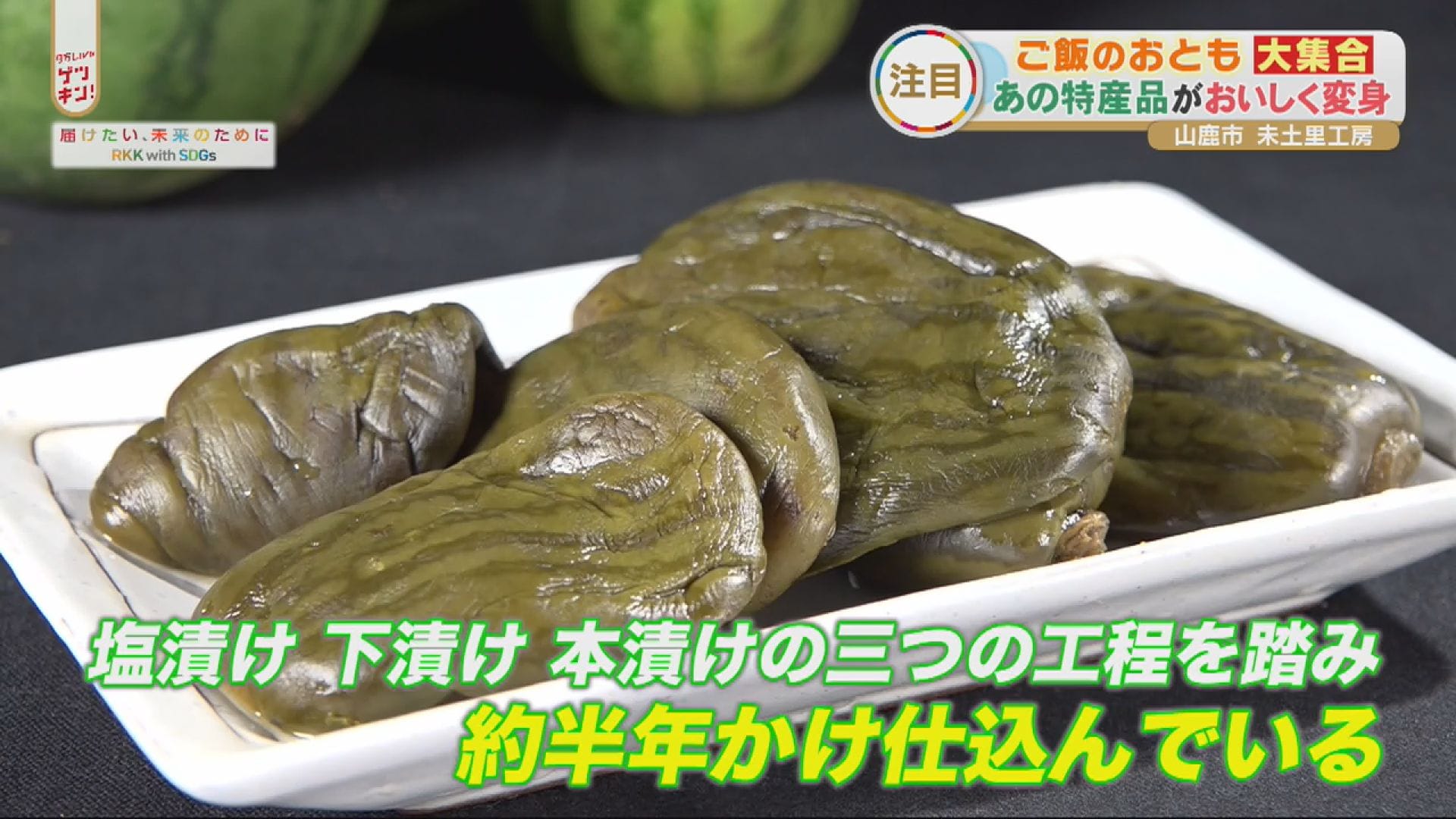 立山さん達の本業はスイカ農家。育てたスイカで作ったのがこちらの漬け物。スイカを大きくする為の間引き作業で摘み取った、小さなスイカを丸ごと利用しています。