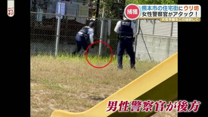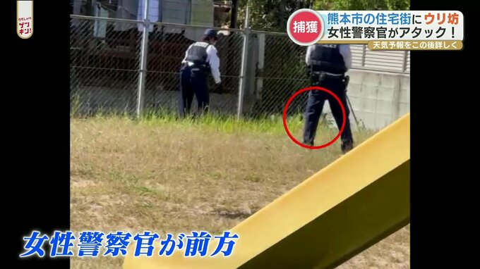 捕獲の陣容は…女性警察官が前方、そして男性警察官が後方。