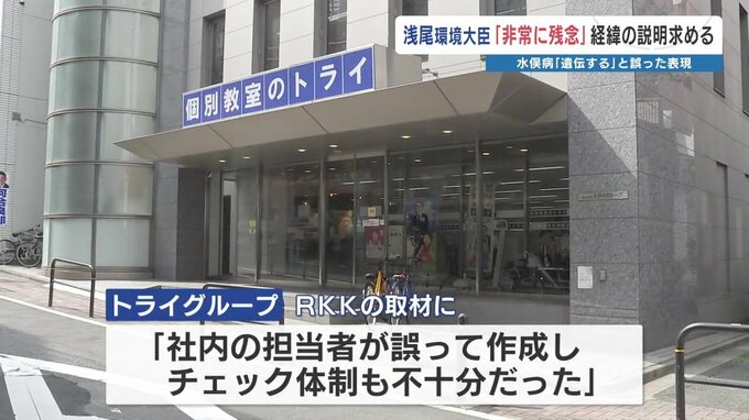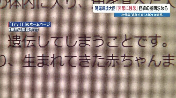 「家庭教師のトライ」グループが『水俣病は遺伝する』と誤った教材を配信していた問題で、浅尾慶一郎環境大臣は「非常に残念だ」と述べ、経緯の説明を求めました。