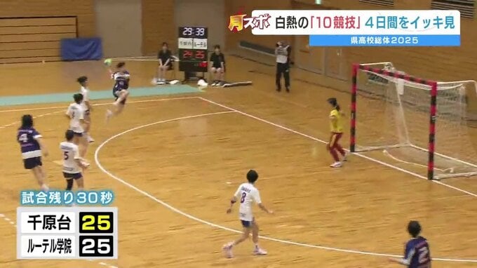 ハンドボール、女子の決勝は千原台とルーテル学院が対戦。試合残り30秒で千原台が同点に追いつくと、直後のルーテル学院の攻撃は反則があり攻守交代。