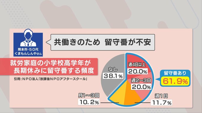 NPO法人「放課後NPOアフタースクール」によりますと、低学年を含めた小学生全体では50.6%、小学校高学年に限ると61.9%が家で留守番をしているということです。