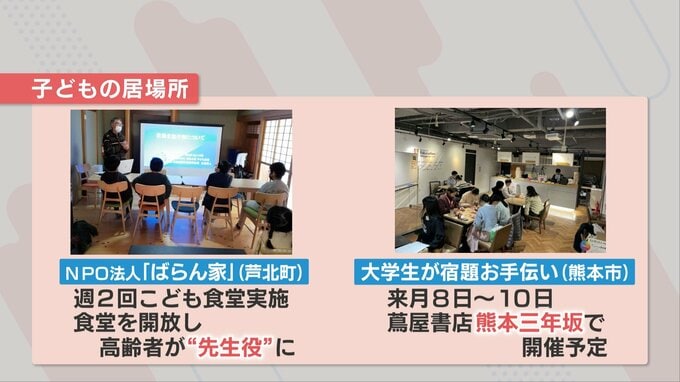 子どもの居場所づくりも各地域で進んでいます。芦北町のNPO法人「ばらん家」では週2回子ども食堂を実施しています。食堂を開放し、宿題などの見守りを続けています。また、お年寄りが「先生役」となって料理教室や絵本の読み聞かせなどの体験イベントも開き、世代間交流の場にもなっているといいます。