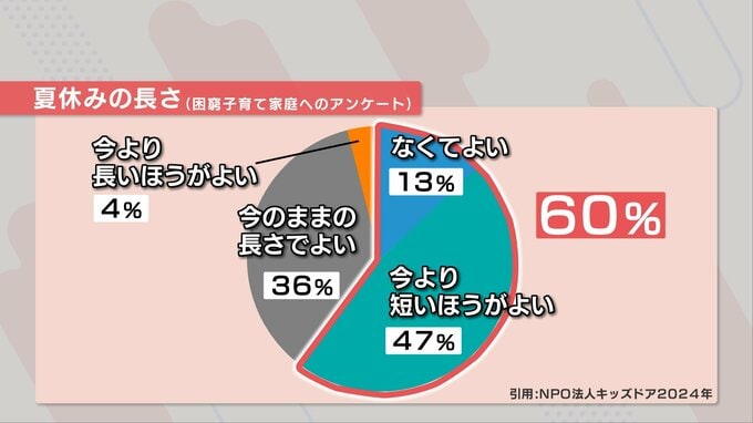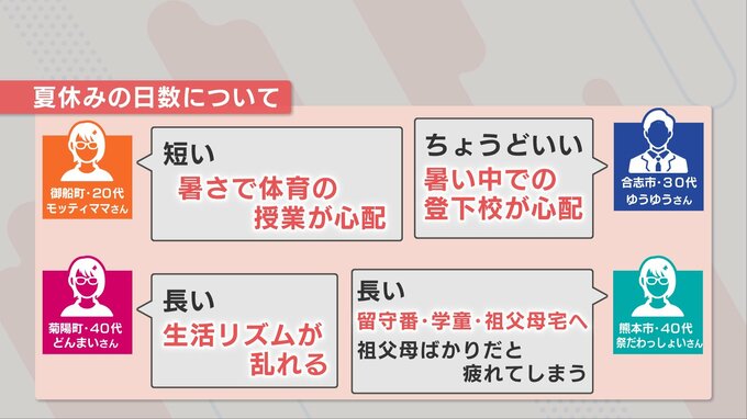 貧困問題に取り組むNPO法人「キッズドア」が、主にシングルマザーなどで困窮する子育て世帯を対象に行った調査です。「夏休み」について6割が「短縮・廃止」を希望していることが分かりました。「子どもが家にいると生活費がかかるから」という意見が最も多かったようです。熊本での街の声です。