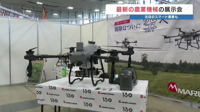 また、最新技術を活用したスマート農業のコーナーも設けられ、ドローンによる薬剤散布機や無人草刈り機なども紹介されています。