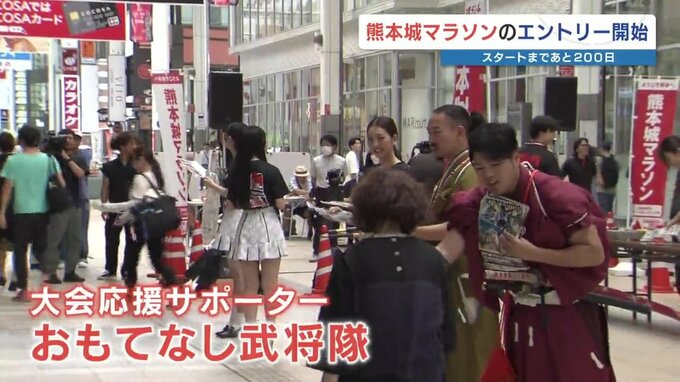 熊本市の下通アーケードでは、大会応援サポーターの熊本城おもてなし武将隊たちがチラシを配って参加を呼びかけました。