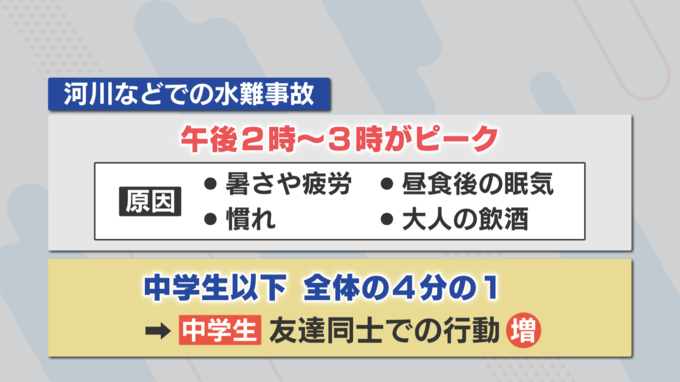水難事故の半分以上は午後に起きていて、中でも午後2時から午後3時前後がピークということです。原因としては、「暑さや疲労」「昼食後の眠気」「大人の飲酒」などが挙げられます。