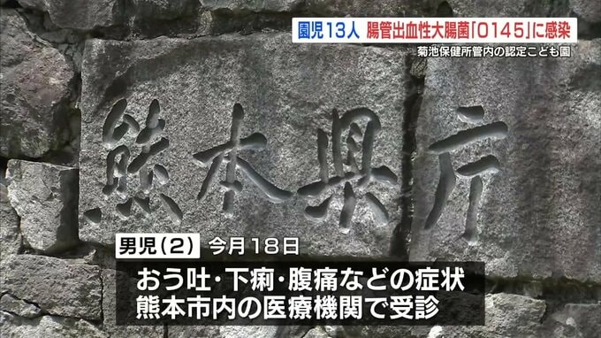 1歳~2歳児13人がO145に感染 熊本の認定こども園 2025年8月1日(金) 09:37 国内 熊本県の菊池保健所管内の認定こども園で、1歳から2歳の13人が腸管出血性大腸菌「O145」に感染しました。県によりますと、7月18日に2歳の男の子が嘔吐や下痢、腹痛などの症状を訴え、熊本市内の医療機関で検査した…