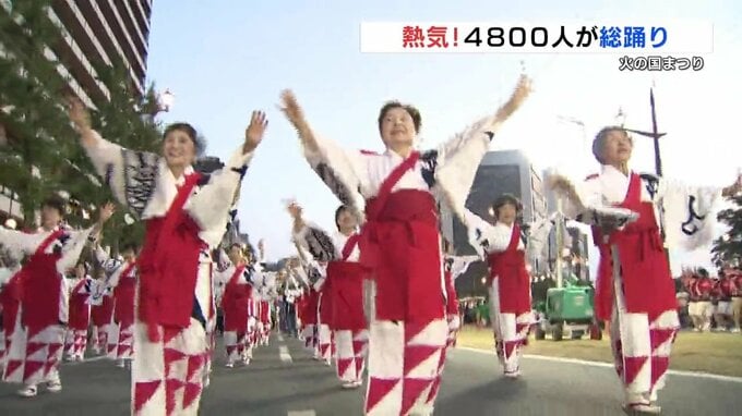 熱気 ! 4800人がおてもやん総踊り 思い思いの衣装でパフォーマンス 2025年8月3日(日) 12:56 国内 火の国まつりのクライマックス「おてもやん総踊り」が2日夜に行われ、熊本市の中心部は熱気に包まれました。今年のおてもやん総踊りには55団体約4800人が参加し、盛り上がりを見せました。「アロハー。一緒に踊り…