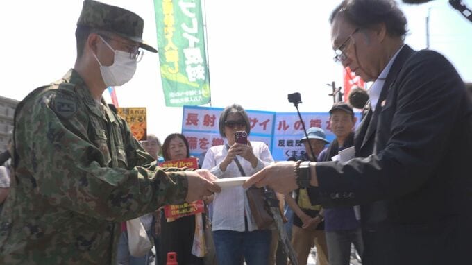 集会の後、楳本共同代表たちは、健軍駐屯地前で防衛大臣たちに宛てた要望書を自衛官に手渡しました。