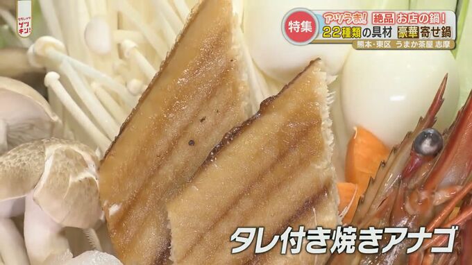 こちらが「志摩」自慢の寄せ鍋。肉・海鮮・野菜など具材は全部で22種類と超豪華!アンコウやタレ付きの焼きアナゴなど、珍しい具材が入っているのも特徴です。