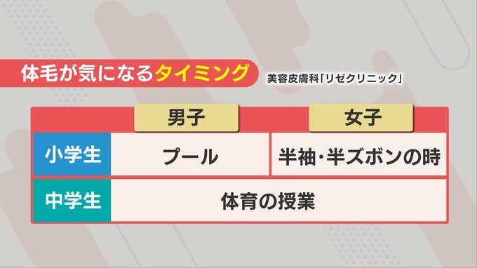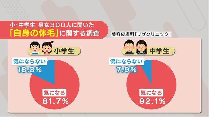 美容皮膚科が全国の小中学生を対象とした調査によりますと、小学生の8割以上、中学生の9割以上が「自分の体毛が気になる」と回答しています。
