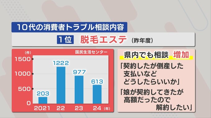 また、若者の脱毛が増えたことで、契約などのトラブルも増えています。昨年度、国民生活センターに寄せられた10代の消費者トラブルで最も多い内容は「脱毛エステ」でした。