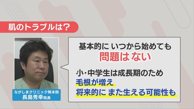 専門医は「基本的にいくつから脱毛を始めても問題はない」としていますが、「小中学生は成長期のため毛根が増える可能性があり、第二次成長期が落ち着く18歳以上で検討してもいいのでは」と話しています。