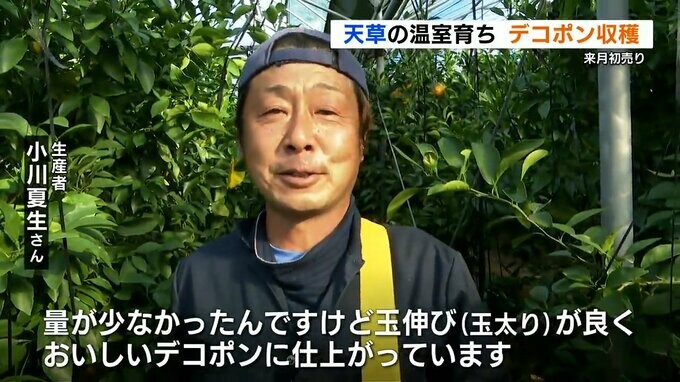 天草市志柿町(あまくさまち しかきまち)にある小川 夏生さんのハウスでは、初出荷に向け直径9センチほどに育ったデコポンの収穫が行われています。