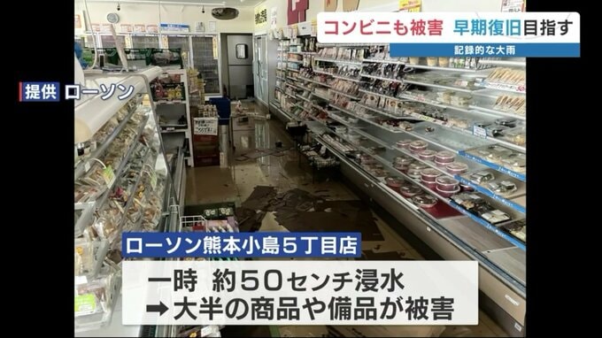 熊本市西区小島の「ローソン熊本小島5丁目店」では一時、50センチほどの高さまで浸水し、ほとんどの商品や備品が被害を受けました。