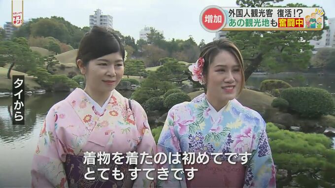 みなさん、どんな場所で楽しんでいるのでしょうか。城彩苑を訪れていたタイからの2人は予約した着付け体験へ。着物姿で散策を楽しみました。