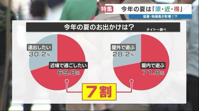 民間の調査によりますと、今年の夏は「できるだけ近場で過ごしたい」「屋内で快適に過ごしたい」と答えた人がともに7割に上りました。