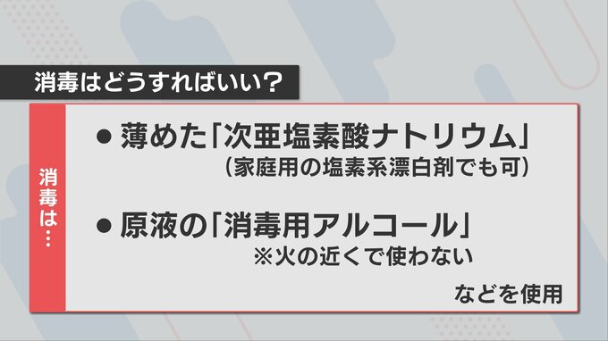その上で、家庭用の塩素系漂白剤や消毒用アルコールなどで消毒するようにしてください。