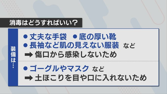 丈夫な手袋や底の厚い靴を履くなどして、傷口から感染しないようにします。また、ゴーグルやマスクを着用して、土ほこりから目や口を守ります。