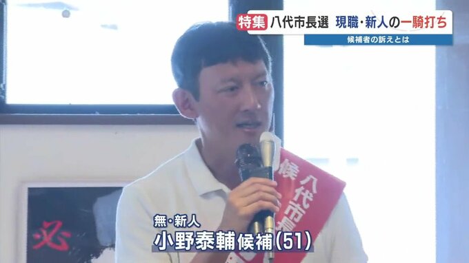無・新人 小野泰輔候補「国政や副知事の経験を通じてたくさんの繋がりがあるので、八代がいち早く復旧するために必要なことを市長としても矢継ぎ早に実行していきたい」