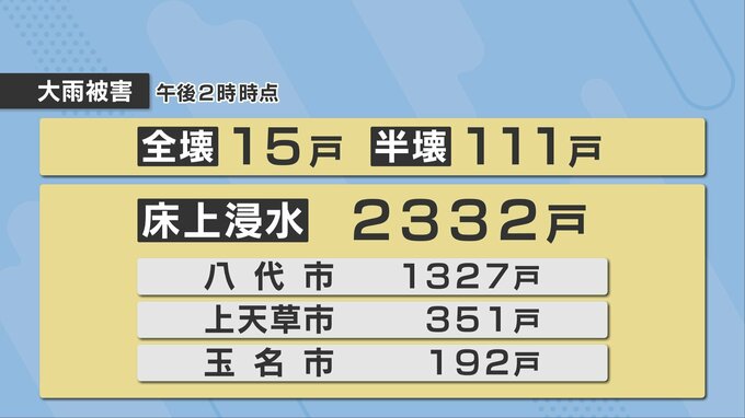 今回の大雨でこれまでに明らかになっている被害です。全壊、半壊が合わせて126戸、そして2300戸以上が床上浸水しています。最も床上浸水の被害が多いのが八代市で1327戸となっています。