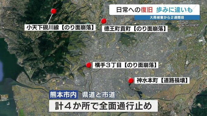 しかし、のり面の上にある市道は復旧の見通しが立たず、熊本市内では県道と市道合わせて4か所で全面通行止めが続いています。