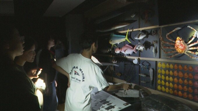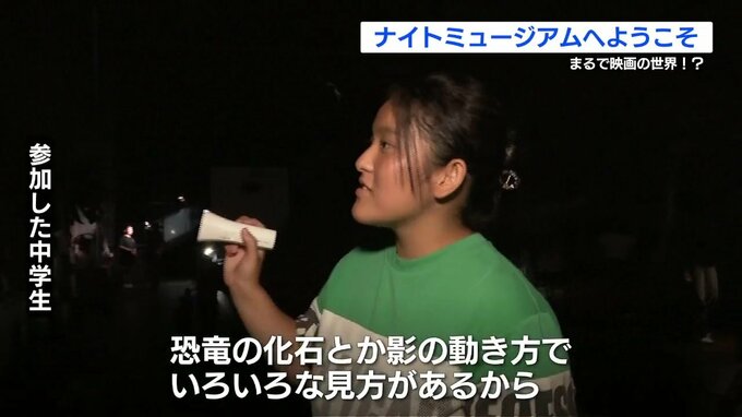 参加した中学生たちは、照明を落とした館内で懐中電灯を手に化石や骨格標本に光を照らし、影の見え方や動き方など普段と違った雰囲気を楽しんでいました。