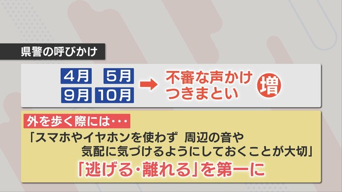 警察は新学期の時期と重なる4月や5月、9月や10月に不審な声掛けやつきまといが増える傾向にあるとして、外を歩く際にはスマホやイヤホンを使わず、周辺の音や気配に気付けるようにしておくことが大切だとしています。