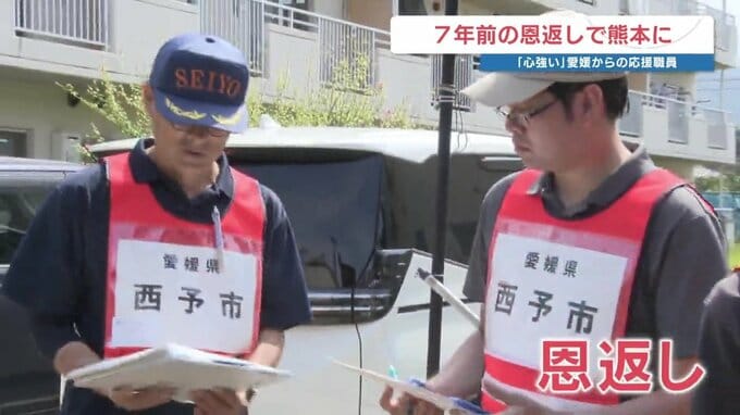 熊本 記録的な大雨の被災地へ 愛媛県西予市からの“恩返し” 職員2人が応援 2025年8月28日(木) 20:08 国内 7年前に西日本豪雨で甚大な被害があった愛媛県西予市の職員2人が、今度は豪雨に襲われた熊本市へ応援に来てくれています。熊本市のボランティアセンターで他の職員と朝礼に参加しているのは、愛媛県西予市の職員、…