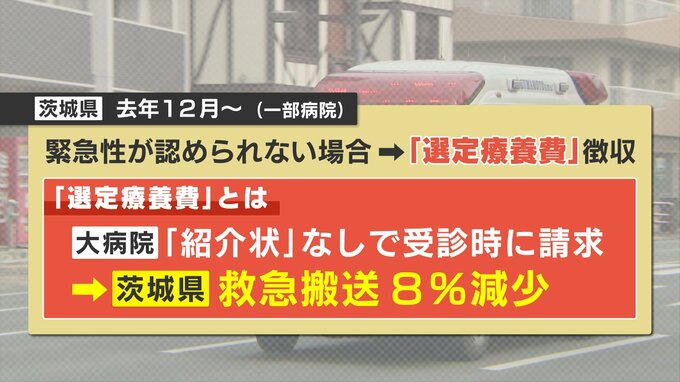 救急車の要請は、全国でも増加傾向で、中には有料化に踏み切った自治体もあります。茨城県は去年12月から、県内全域で緊急性が認められない場合は、一部の大きな病院で「選定療養費」を徴収する仕組みを取り入れています。