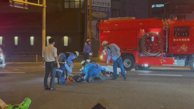 消防などによりますと、昨日(10月7日)午後11時過ぎ、熊本市中央区の国道3号、代継橋交差点で乗用車とバイクが衝突しました。
