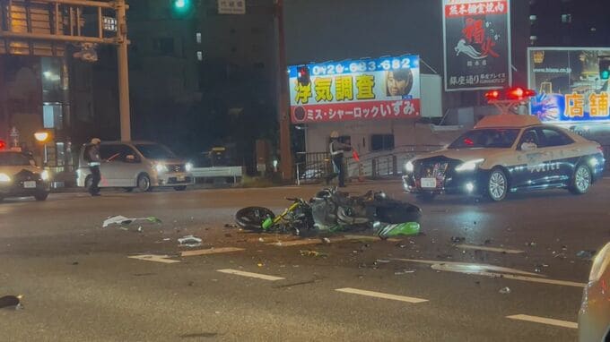 10月7日の夜遅く、熊本市中心部で起きた事故でバイクが大破しました。乗っていた男性は重傷です。