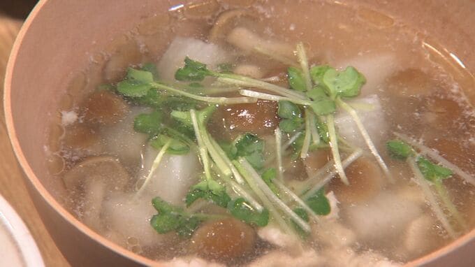 ②皮をむいて1cm角に切った長いも、さっと洗ったなめこ、水、酒を加えて煮立て、弱火で5分ほど煮て、塩・しょうゆで味を整えたらできあがり。