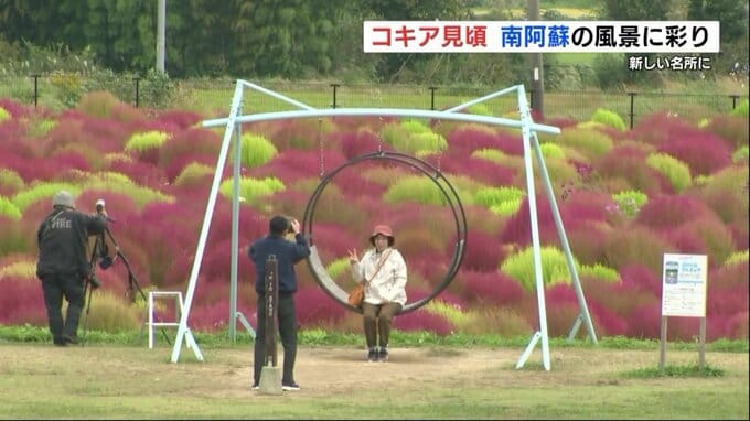 熊本県南阿蘇村で5000株のコキアが色づき、見ごろをむかえています。